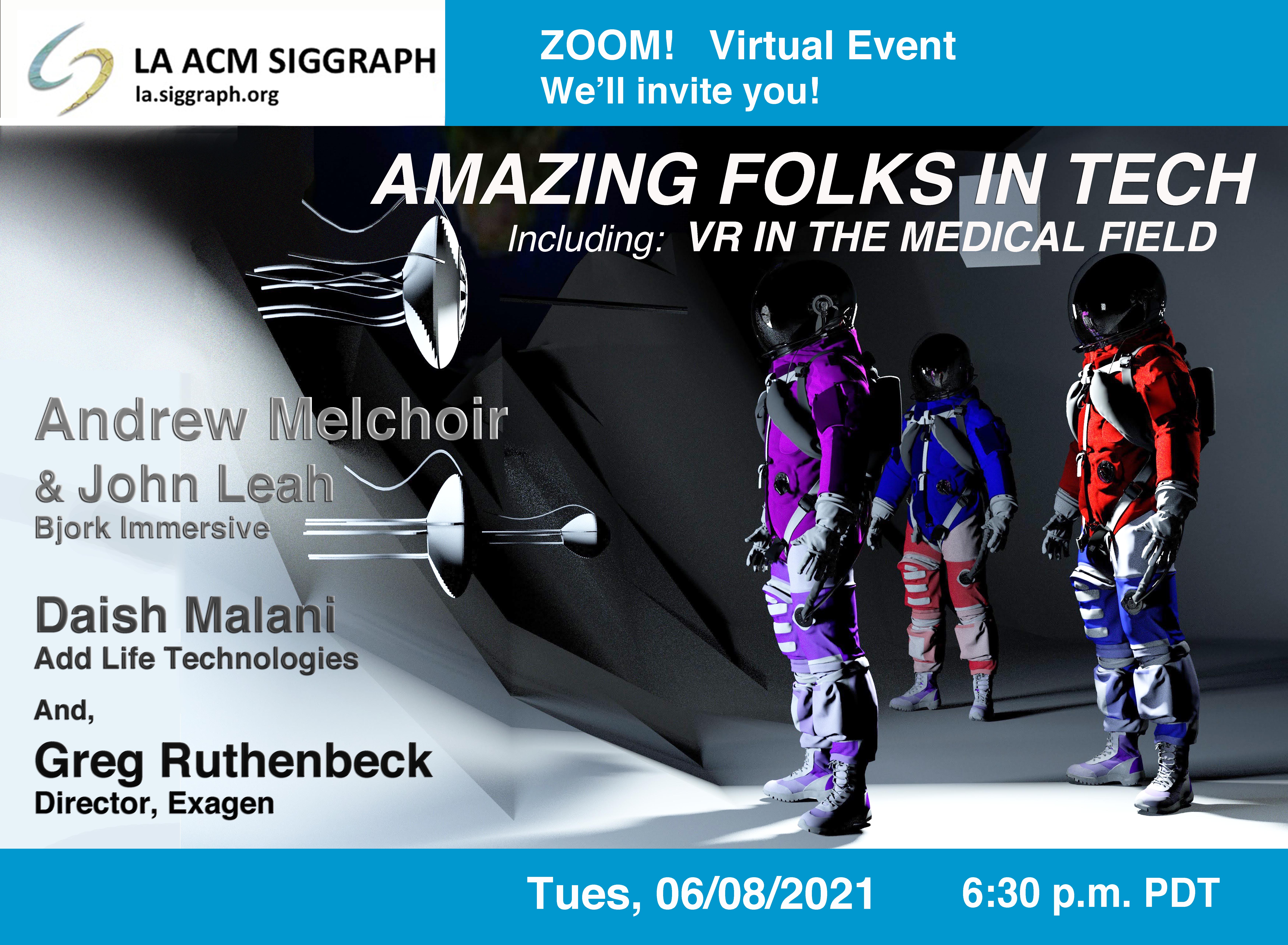 As medical professionals strive to use VR with accuracy: learn from three medical professionals using VR. Amazing Folks in Tech will be LA ACM SIGGRAPH's June 8th event. Presenters include: John Leah, and Andrew Melchior, from 3rd Space Agency; Daish Malani, from Add Life Technologies; and Greg Ruthenbeck, with Exagen Oy. Kyle Carlin will be the moderator. Register with Zoom.
