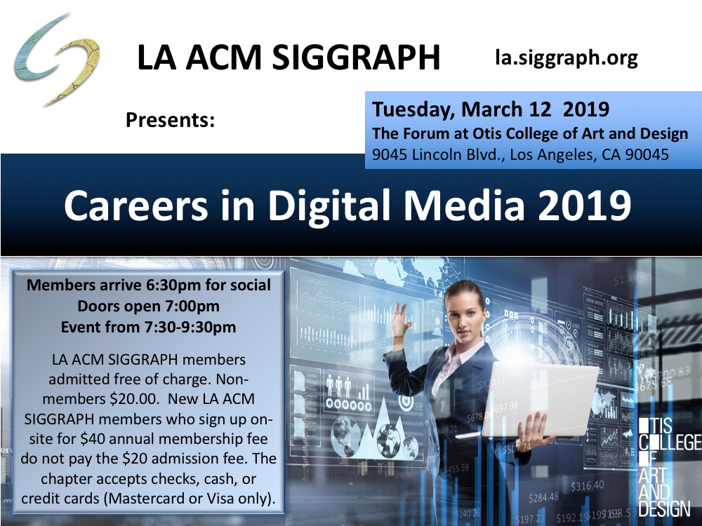 All LA ACM SIGGRAPH will be admitted free of charge. Non-members of LA ACM SIGGRAPH are admitted for $20.00. New LA ACM SIGGRAPH members who sign up on-site, and pay the $40 annual membership fee, do not have to pay the $20 admission fee. The chapter accepts checks, cash, or credit cards (Mastercard or Visa only) for all dues or fees.