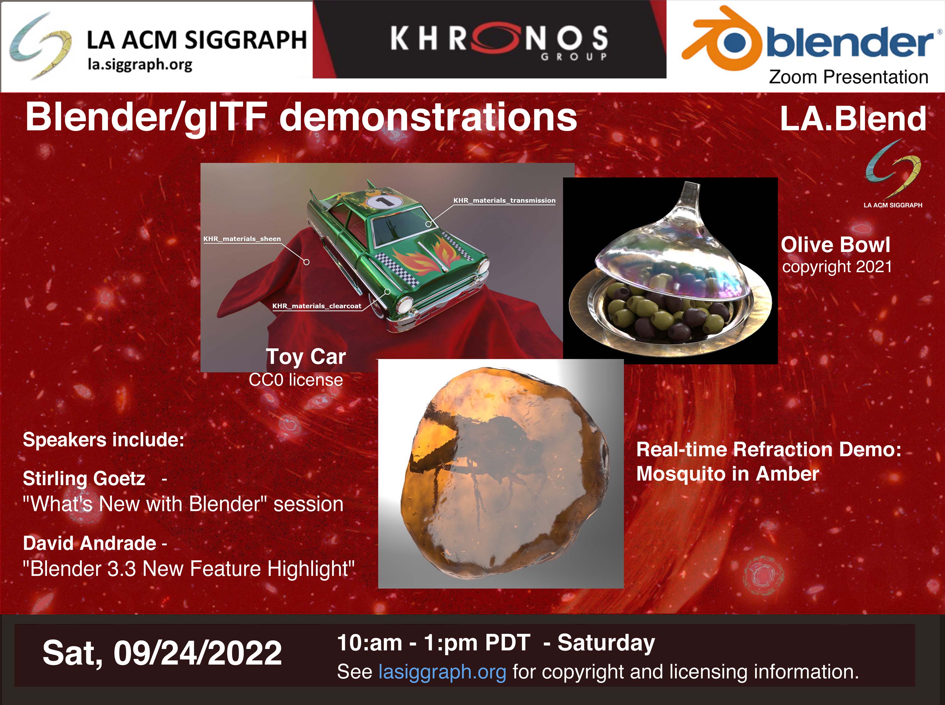 LA SIGGRAPH joins LA.Blend for a joint event showcasing the latest features of Blender V3.3 (direct Zoom link). There will be a special presentation from artists from the Khronos Group to highlight the new import/export capability of Blender with glTF models and Physically Based Rendering (PBR). Image credits on event page.