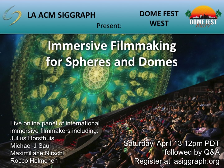 Explore the forefront of immersive filmmaking with a global lineup of emerging and established artists sharing their experiences producing animated films for large-scale dome theaters. Produced by LA SIGGRAPH in cooperation with Dome Fest West.