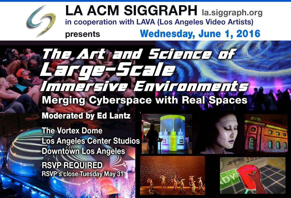 The Art and Science of Large-Scale Immersive Environments: Merging Cyberspace with Real Spaces. Come join LA SIGGRAPH and the LA Video Artists Wednesday, June 1, at the Vortex Dome at the Los Angels Center Studios.