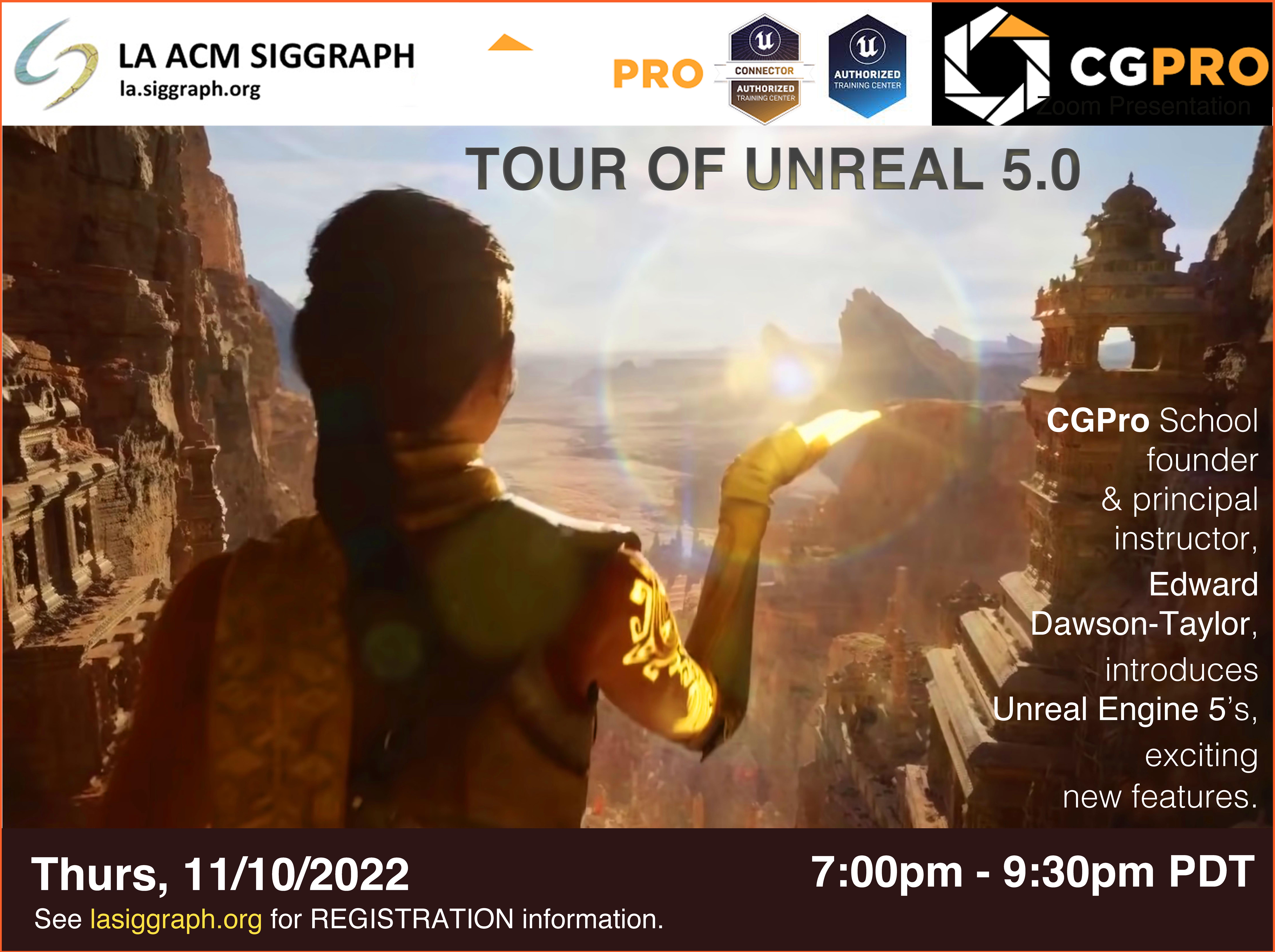 Unreal 5.0 was formally released in April 2022 with the promise of empowering next-generation real-time 3D content and experiences with greater freedom, fidelity, and flexibility than ever before. New features include Lumen, a fully dynamic global illumination and reflections system, Virtual Shadow Maps with high-resolution shadowing, World Partition Tool which breaks the world into grids which only load when needed and MetaHuman Character Creator which allows realistic characters to be created at will. CGPro School’s founder and principal instructor, Edward Dawson-Taylor, introduces Unreal Engine 5 for beginners then takes us on a tour of UE5’s new capabilities in this interactive virtual event featuring case studies with live demonstrations.