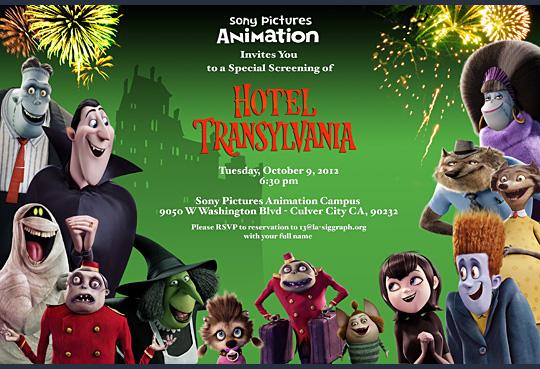 LA ACM SIGGRAPH presents a screening of Sony Pictures Animation's new "Hotel Transylvania"! RSVP for an evening on the lot in Culver City and watch their new masterpiece in the Ray Harryhausen Theater. Joining us for the introduction of the film will be a special guest artist! Be sure to RSVP by October 7th!