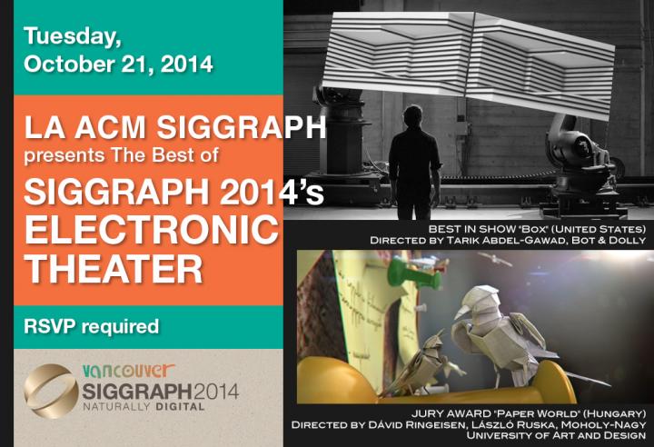 Los Angeles ACM SIGGRAPH, with Walt Disney Feature Animation, will present the SIGGRAPH 2014 Computer Animation Festival. This Festival will present dozens of the best computer animated films culled from around the world. RSVP's are required.